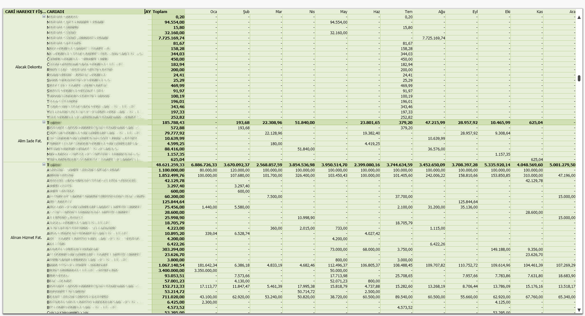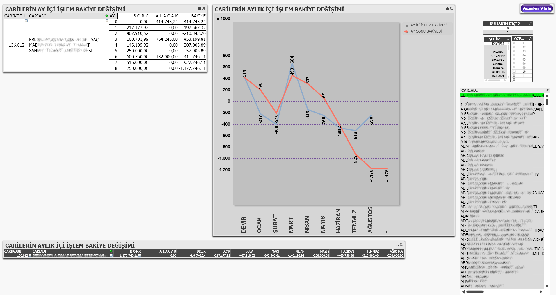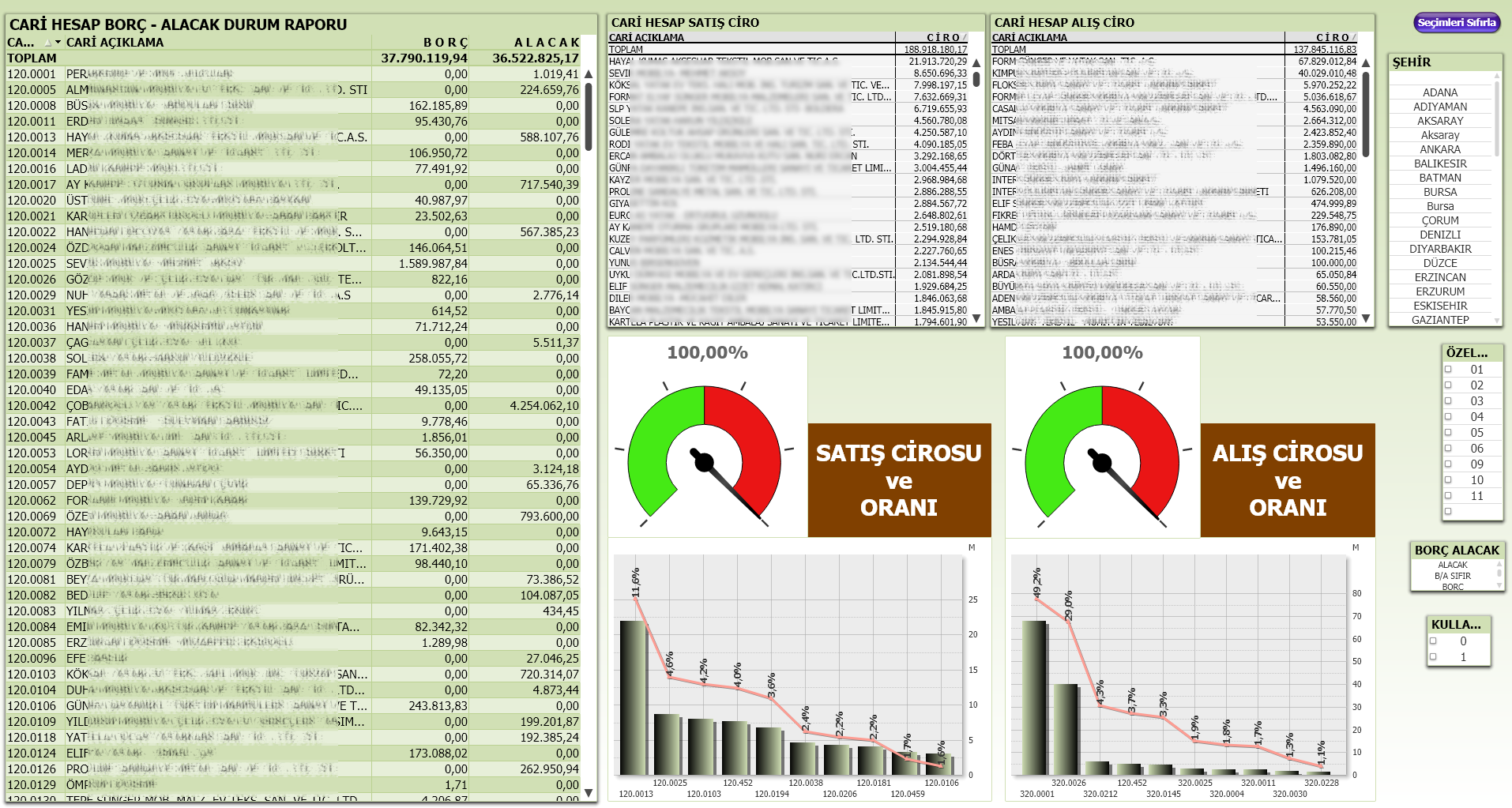 Bütün bu seçenekler, ilgili veri tablosundan çektiğimiz alanlara göre arttırılabilir. Örneğin TÜRKİYE geneli çalışıyor isek, ŞEHİR alanı ile, o şehirdeki cari hesaplarımıza anlık ulaşabiliriz. Onların durumunu anlık görebiliriz. En önemlisi bütün bunları her seferin de raporu baştan almadan yapabiliriz. Verileri çektikten sonra üzerinde istediğimizi yapabiliriz. İstersek bunları grafiksel olarak da görebiliriz. Başka uygulamalarımız da bunlarla ilgili örneklerde paylaşıyor olacağız.