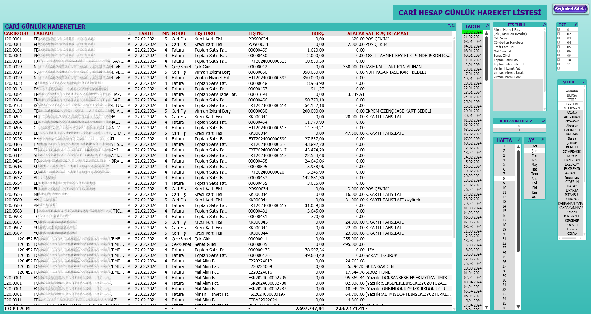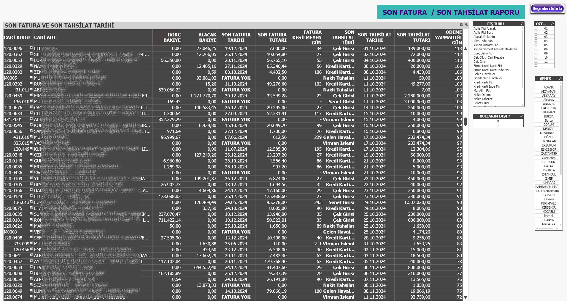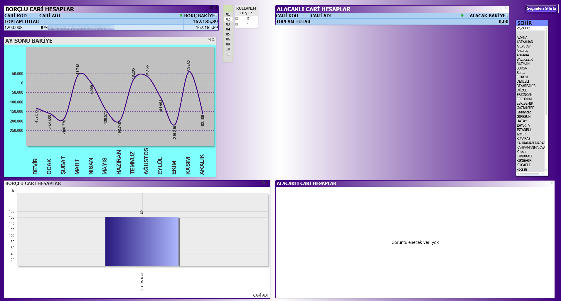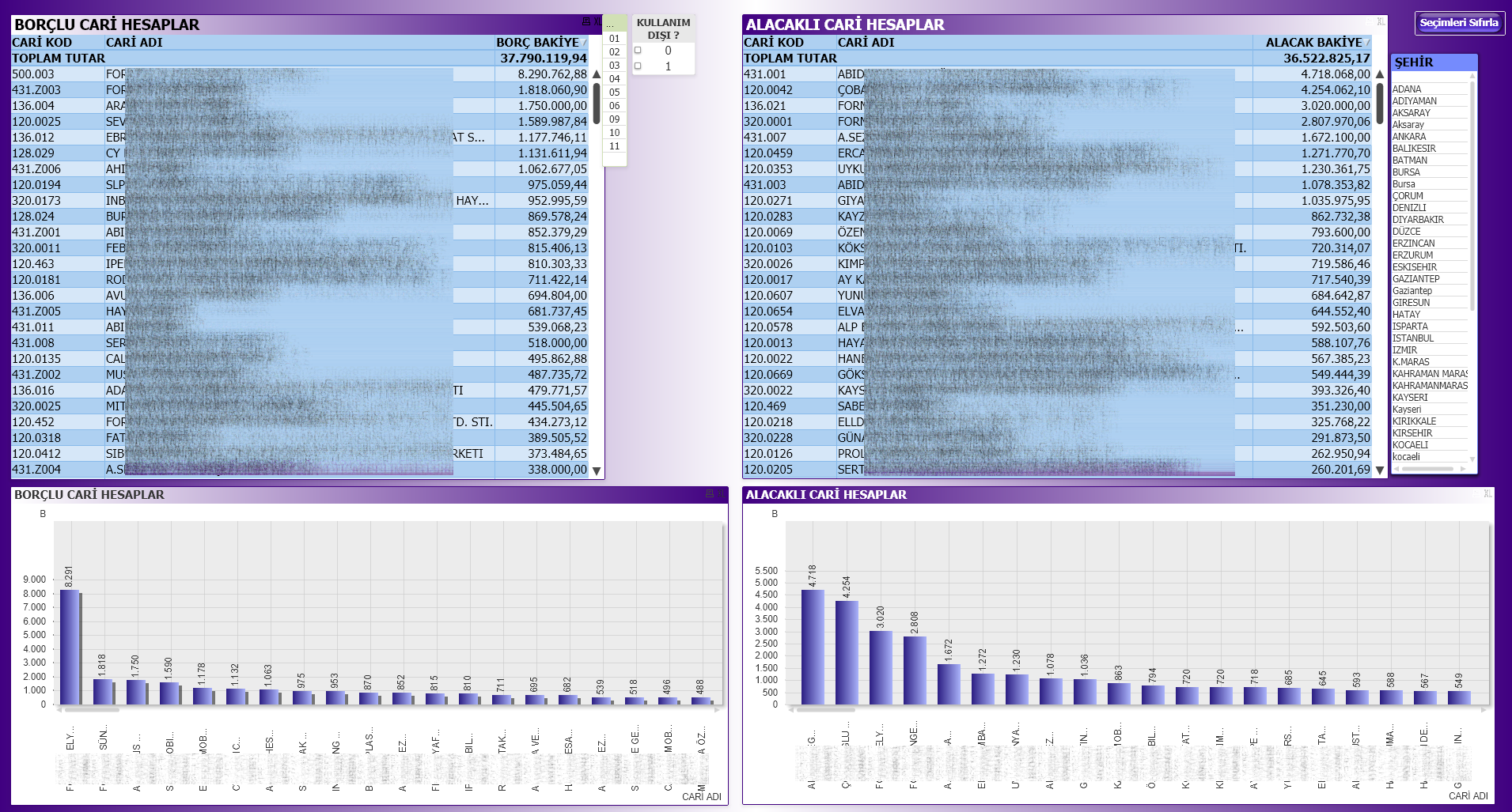 Bütün bu seçenekler, ilgili veri tablosundan çektiğimiz alanlara göre arttırılabilir. Örneğin TÜRKİYE geneli çalışıyor isek, ŞEHİR alanı ile, o şehirdeki cari hesaplarımıza anlık ulaşabiliriz. Onların durumunu anlık görebiliriz. En önemlisi bütün bunları her seferin de raporu baştan almadan yapabiliriz. Verileri çektikten sonra üzerinde istediğimizi yapabiliriz. İstersek bunları grafiksel olarak da görebiliriz. Başka uygulamalarımız da bunlarla ilgili örneklerde paylaşıyor olacağız.